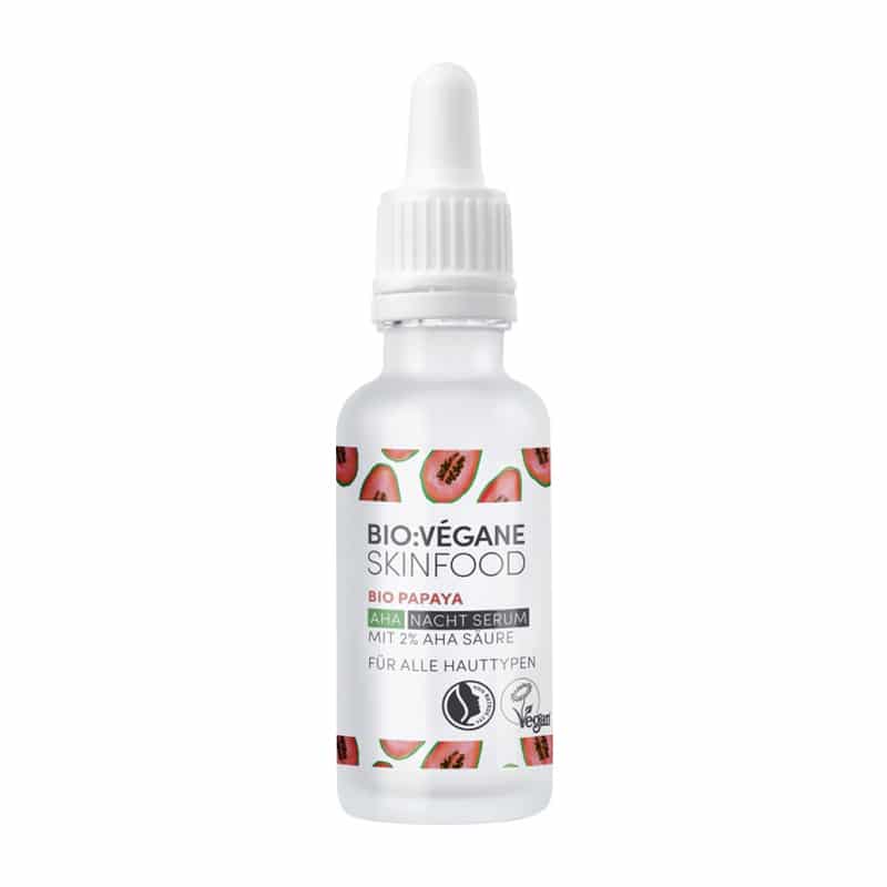 Το Bio Vegane Organic Papaya AHA Night Serum διαθέτει φυσικά, καταπραϋντικά οξέα AHA και υποστηρίζουν τη διαδικασία ανανέωσης του δέρματος, ενώ τα εκχυλίσματα superfoods που λαμβάνονται από οργανική παπάγια εξομαλύνουν το δέρμα.