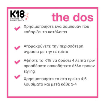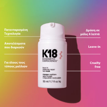 Ταξιδεύοντας μέσα στα εσωτερικά στρώματα της τρίχας για να φτάσει στον πυρήνα των πολύπεπτιδικών αλυσίδων (αλυσίδων κερατίνης), το καινοτόμο K18Peptide™ διαθέτει το σωστό μέγεθος και την κατάλληλη σύνθεση για να εισχωρήσει και να επανασυνδέσει τις σπασμένες αλυσίδες. Μάλιστα, η διαφορά είναι ορατή ήδη από την πρώτη εφαρμογή των Κ18 προϊόντων.